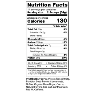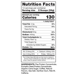 Each serving has 20g plant protein, 2 shots of espresso, and only 3g of sugar and is naturally sweetened, and now made with pea and pumpkin seed protein.